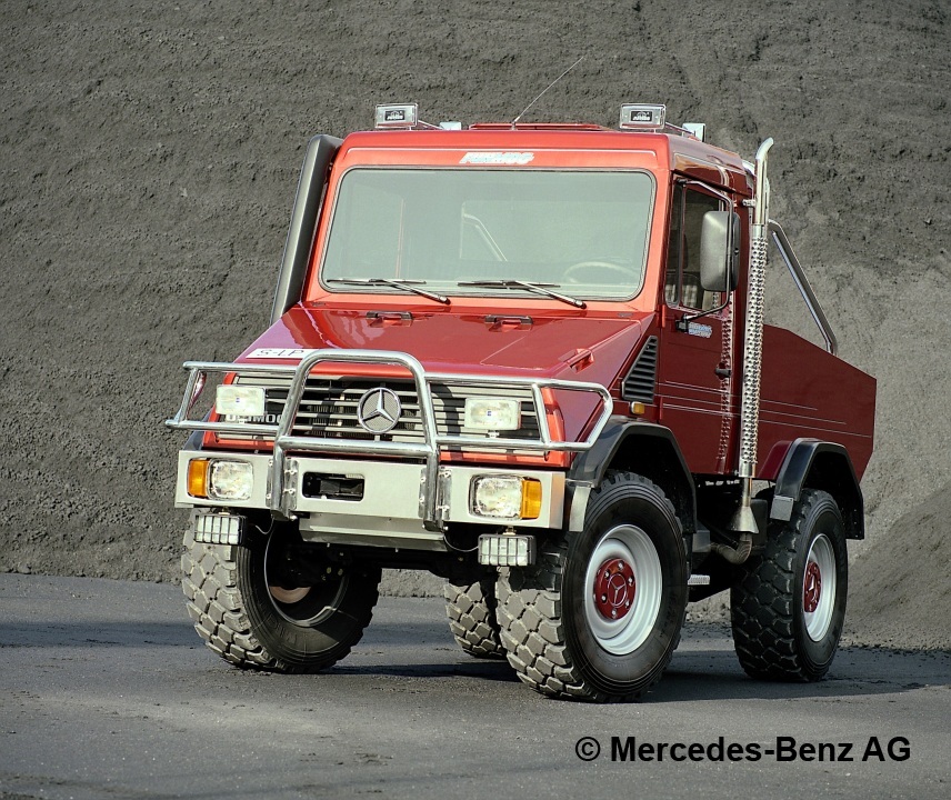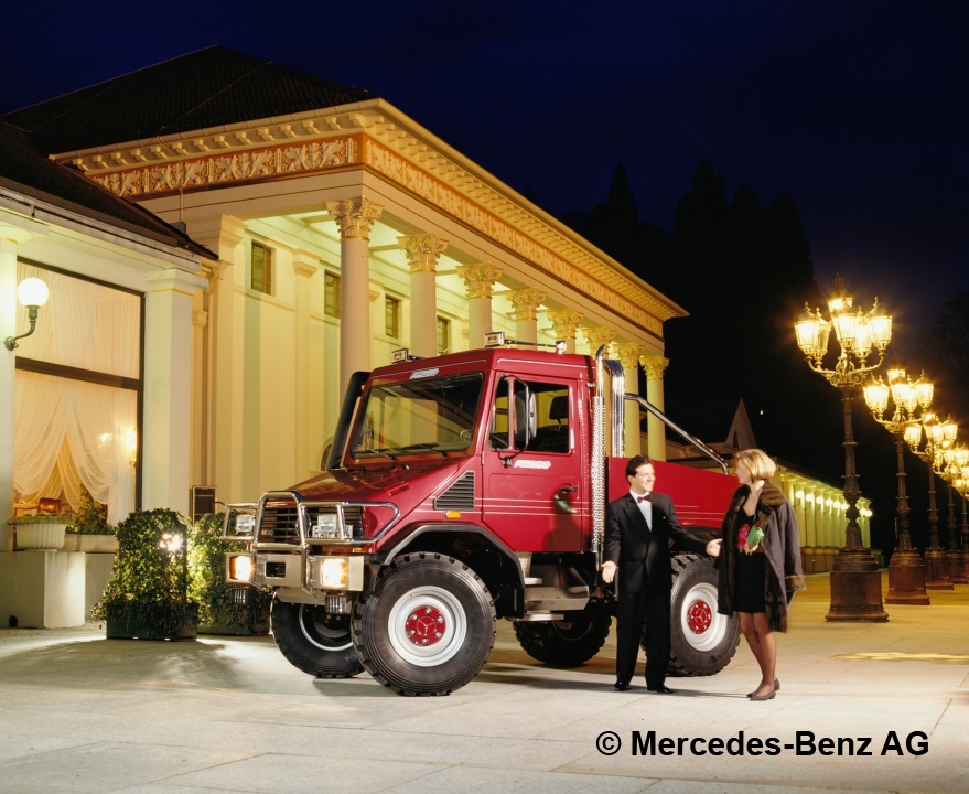 TrucksPlanet claims that the Funmog featured many options taken from the contemporary S-Class. These included leather seats, tinted windows, improved climate control, and electrically-operated mirrors, seats, and windows. There was also a hands-free music and phone system installed because, to again quote Mercedes, this truck was for “going to the disco by Unimog.” That might explain the various bits of chromed metal on the exterior.