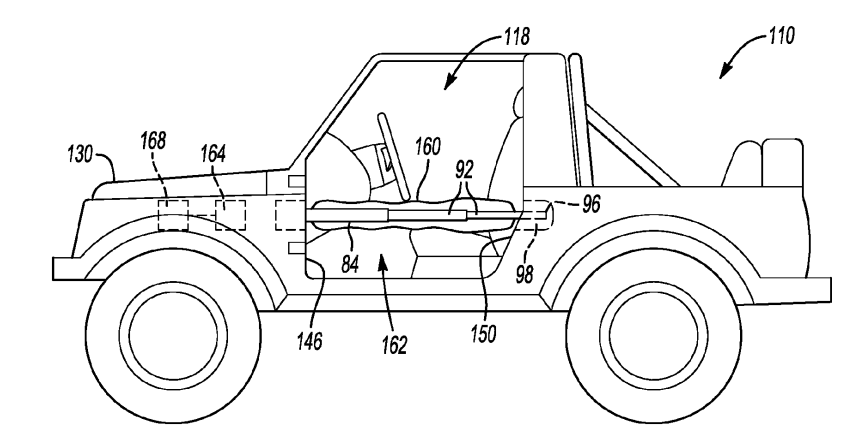 In a Jeep Wrangler, the airbag is deployed from the seatback toward the front. Obviously, that is a far simpler way of dealing with side airbags. Nonetheless, this is an alternative to that process. Now, just because a patent is applied for, does not guarantee it ever makes it to production.