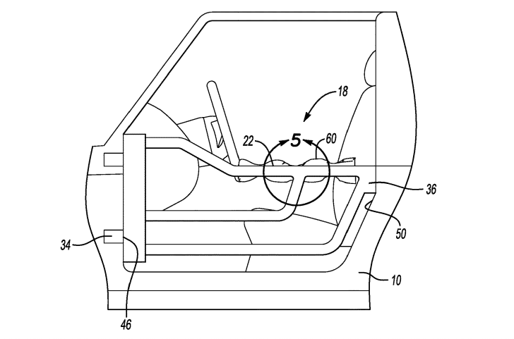 Poking around recent patent applications they discovered this one from FoMoCo for an “assembly and method using an inflatable device within a vehicle having a detachable door.”