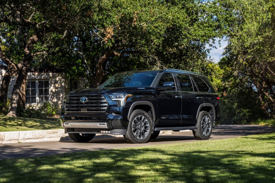 According to Edmunds, the base Sequoia SR5 comes with technology like a 7-inch touchscreen, a Wi-Fi hotspot, Apple CarPlay/Android Auto, an eight-speaker audio system, and three-zone automatic climate control. Additionally, the full-size SUV rolls off the lot with 18-inch wheels, LED head- and foglights, heated side mirrors, a sunroof, and a power-adjustable driver’s seat.