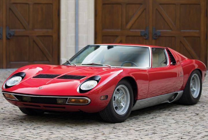 Manufactured from 1966 to 1973, the Lamborghini Miura was one of the first mid-engine road cars and showcased a revolutionary design by Marcello Gandini at Bertone. A V12 engine, positioned transversely behind the driver, set a new standard for delivery and handling in contemporary sports cars. The Miura produced around 350 horsepower, which propelled it to over 170 mph.