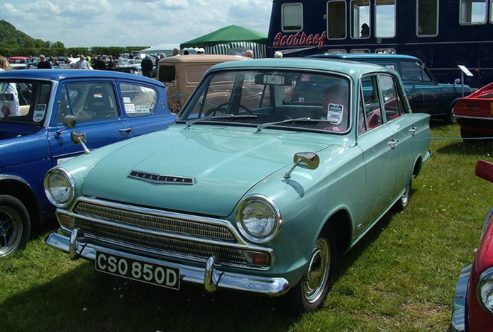 The iconic Mk1 Ford Cortina, meticulously restored in 2007 with a bare metal respray in original Ford Ermine White (code BA), shines with a nearly flawless paint job and pristine chrome bumpers and trims. It’s a four-door variant, maintaining its originality without the usual Lotus Cortina modifications, and features an immaculate engine bay.