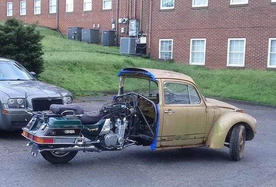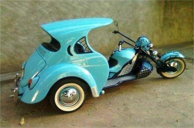 To show the Beetle’s versatility here’s two completely different tasks on the same theme. One chose one way and one the other. One uses the motorcycle for power while the other chooses the VW flat-four power. If the builders worked in unison this freak show might have taken just one Bug and one