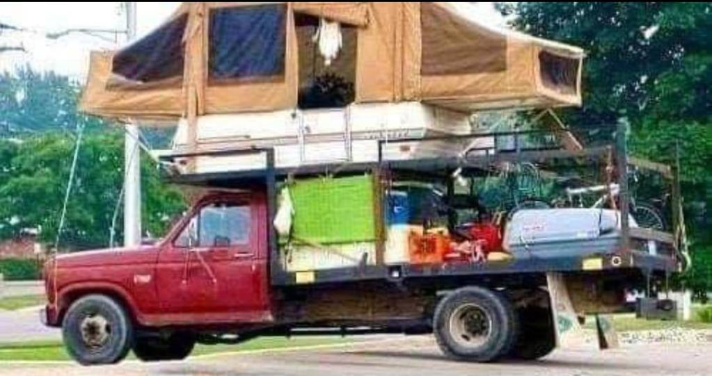 Rather than lengthen his rig as other examples in this week’s Freak Show Friday, this ingenious builder decided to go up with his needs. Atop the flatbed is his or her living quarters. It appears there is even some laundry hanging inside of the tent drying out. This old Ford is hauling a lot of stuff as you can see, but it is also being adapted to the era of COVID-19, riots, and rabid birds we are currently experiencing.