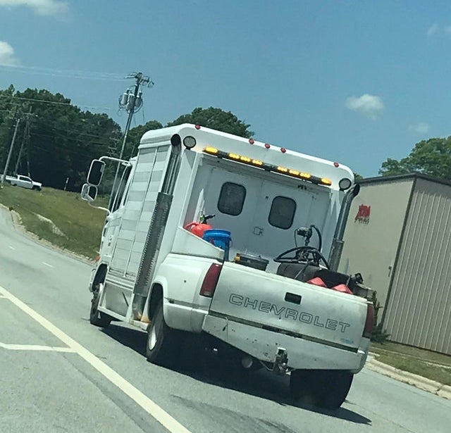 This looks to be a mishmosh of cab-over front, pickup box, and then bed. Again, we feel it is ingenuity that combines crap lying around and assembling them in a practical, cheap, and freakish way. Honestly, when you divorce yourself from how it looks, how could you build a more practical hauler than this?