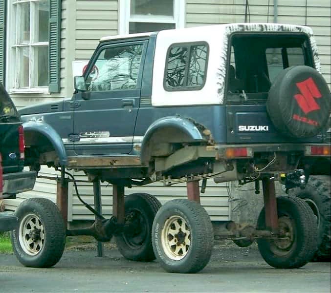 We have no idea what this is about. Remember what we said about the higher the lift making a 4×4 look better? Well, forget about that. There is no rational explanation for lifting this Suzuki like this. The lateral stress alone will collapse the suspension or rip it out of the chassis. And it can’t be for clearance as your clearance is only as good as your axle centerline. In this case that hasn’t changed. What we know for sure is that the driveshafts are nowhere to be found. So, maybe this is some kind of inside joke, while those of us on the outside find it too puzzling to laugh at. Or not.