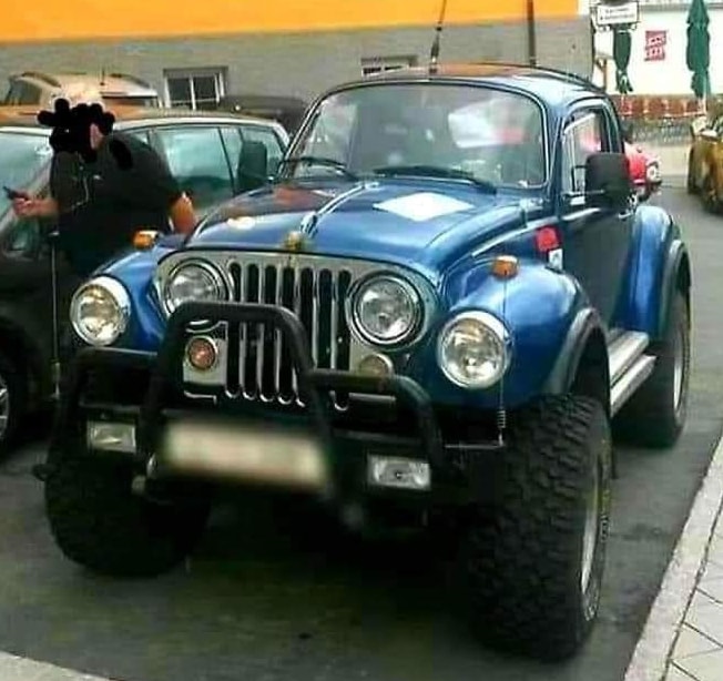 Here’s a well-done execution of a terrible idea. The classic Jeep grille only works for a Jeep, though we give props for the execution. And the paint, which makes this a Superleggera Freak Show. Besides that, the wheels and tires match and there is even chrome. Wow! We are assuming this is a VW bug body bonked onto a small 4×4 chassis. Especially with those vents in the hood, we’re thinking there is an engine lurking under there. Regardless, this is a freak of epic proportions.