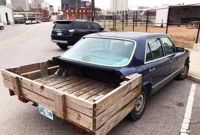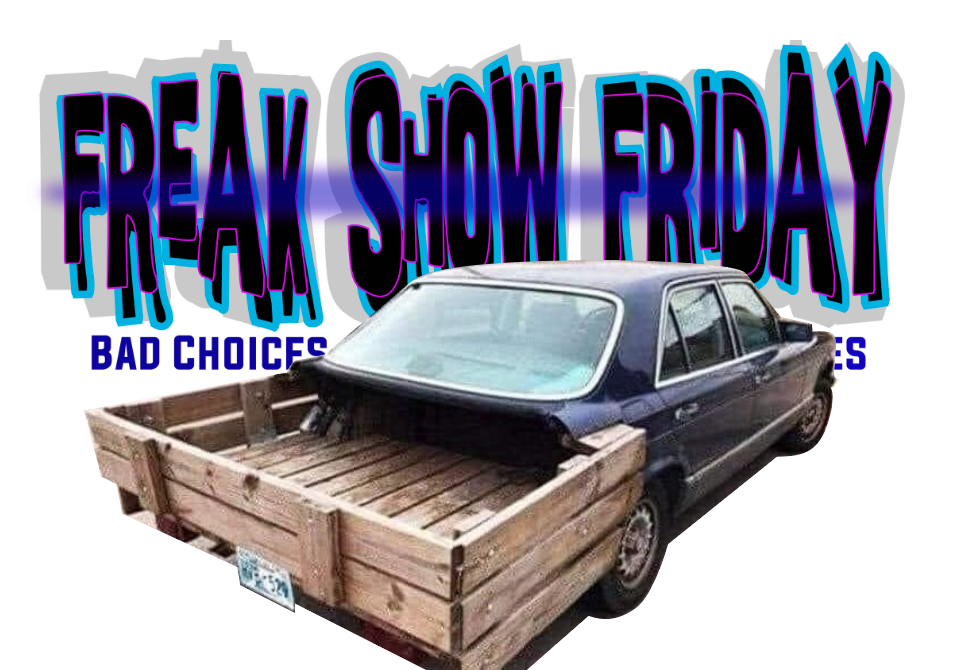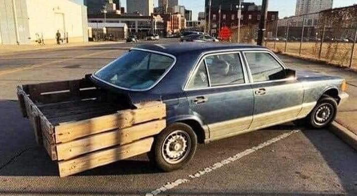 Maybe this builder was going after a modern version of the Beverly Hillbillies Olds truck. Or maybe they saw an opportunity to travel in style while they haul manure. Whatever this was supposed to be it is rude and crude. What would make it even more freaky is if it was the 560 SEL top-of-the-line model. If you’re going to go for it go all the way.