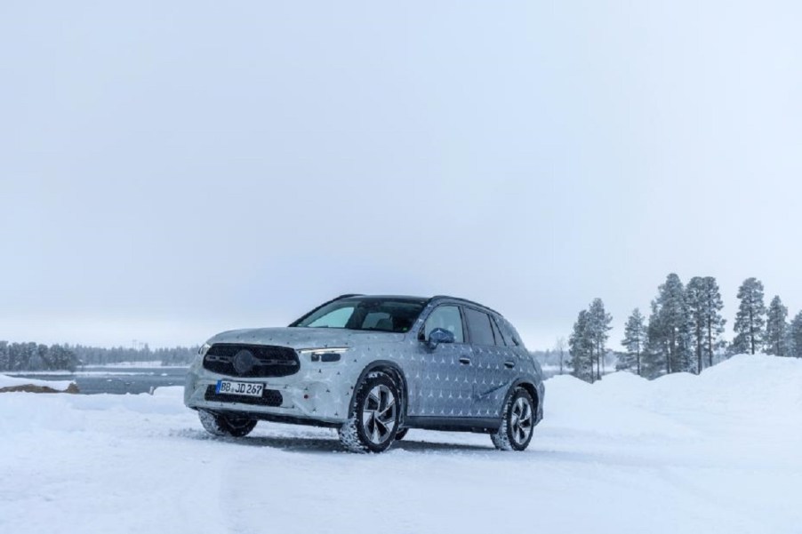 Now, the company is teasing us with new images from winter testing in Sweden of a camouflaged 2023 GLC.