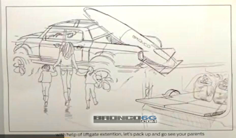 The Bronco truck sketch is seen as a four-door option with a surfboard in the truck bed. This shows Ford’s desire to create vehicles to better meet the needs of those who go adventuring. A mother with kids is also included in the sketches to show a new family truck? The pieces of the puzzle are still being put together.