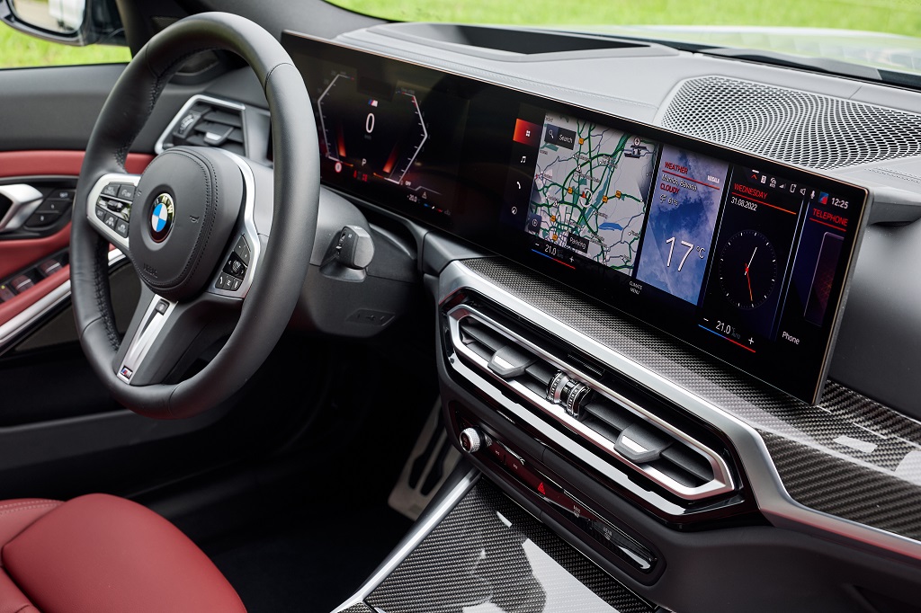 Forget envelope-sized nav screens in these two cars. Both the BMW and the 2024 Mustang have fully immersive screens that surround the driver. Previous (as in the current 2023 version) Mustang has a screen that, while large, has to be supplemented with a gauge-cluster screen to show you all of the information you need. We won’t be surprised if more cars add wrap-around screens like these two in the future.