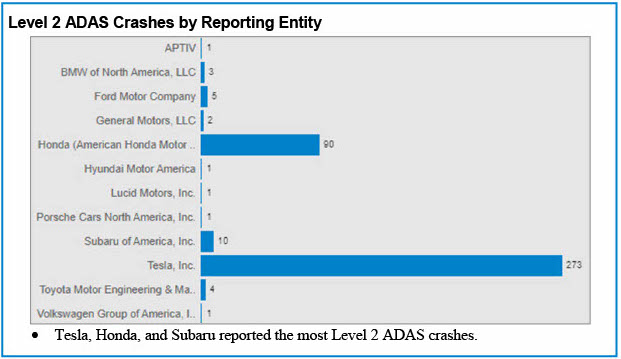 It’s also necessary to consider the number of vehicles on the road with Level 2 ADAS capabilities. Manufacturers such as Tesla, which sell more vehicles with these features, will end up more predominantly featured in reports such as the NHTSA’s.