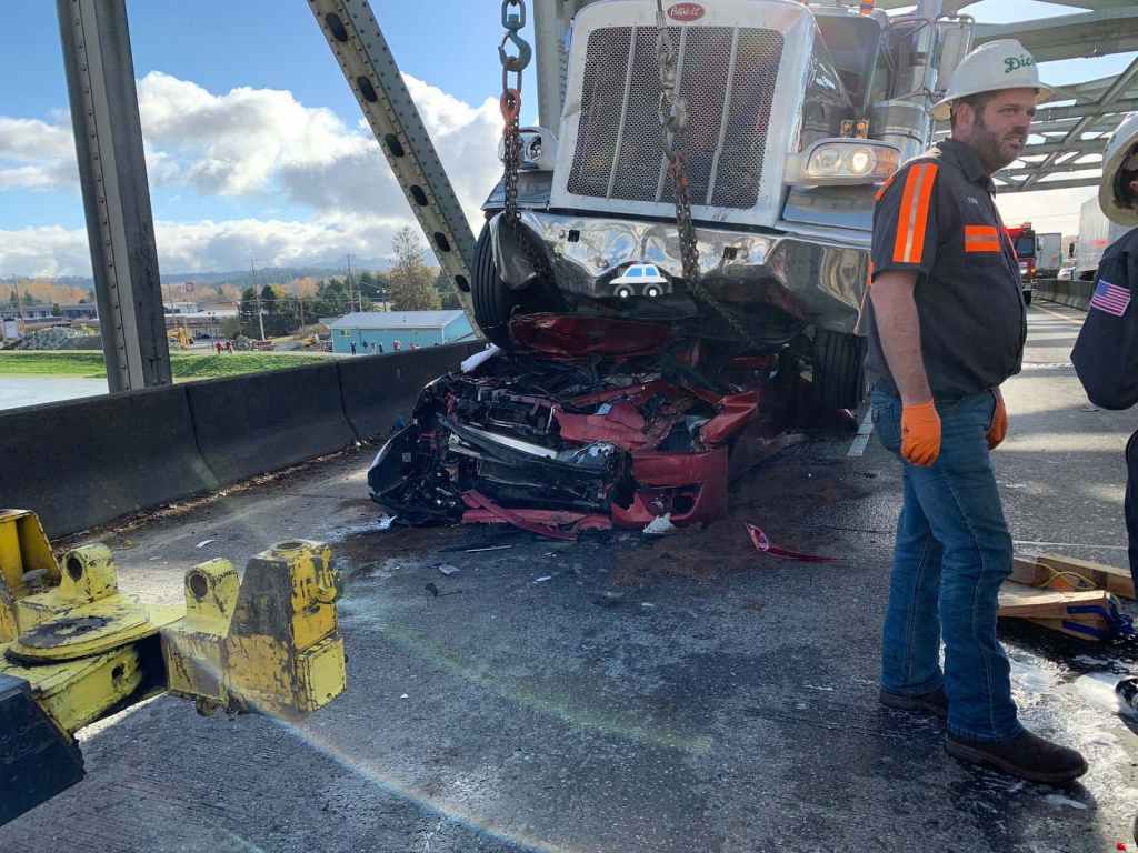 Officer Oliphant says the crash occurred because a truck slowed in front of the Altima, causing the Nissan Altima drivers to hit the brakes. The truck behind the Altima failed to slow down quickly enough and smashed into the rear of the Nissan Altima, jamming it into the back of the other semi-truck.