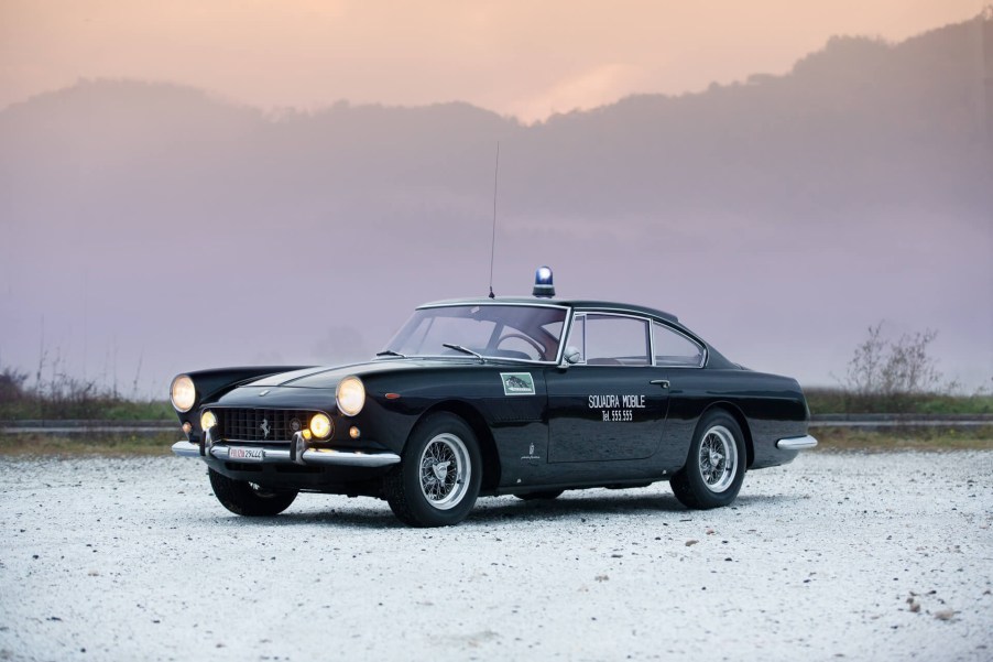 Police cars come in all shapes and sizes. While the quintessential US cop car is the Ford Crown Victoria, police departments have used a variety of vehicles to fulfill their duties. Pickup trucks, Jeep Cherokees, and BMW M5s have all been brought in to protect and serve. The Dubai police’s fleet, though, includes high-end supercars like a Bugatti Veyron. However, there’s one classic Ferrari police car that even the Dubai PD doesn’t own. That’s the 1962 Ferrari 250 GTE 2+2 modified for Roman service.