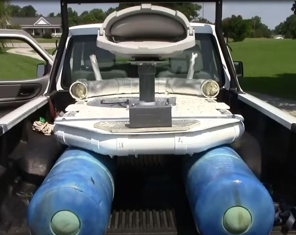 One of the design elements in this particular build is that the pontoons swivel. That’s a nice touch that makes it possible to have the entire contraption fit inside a pickup truck’s bed. So, portability is a definite plus of such a boat build. Also, the design itself seems to be pretty stable, as the captain was seen at one point standing on it. Even with the weight shift, the personal-sized vessel handled it well.