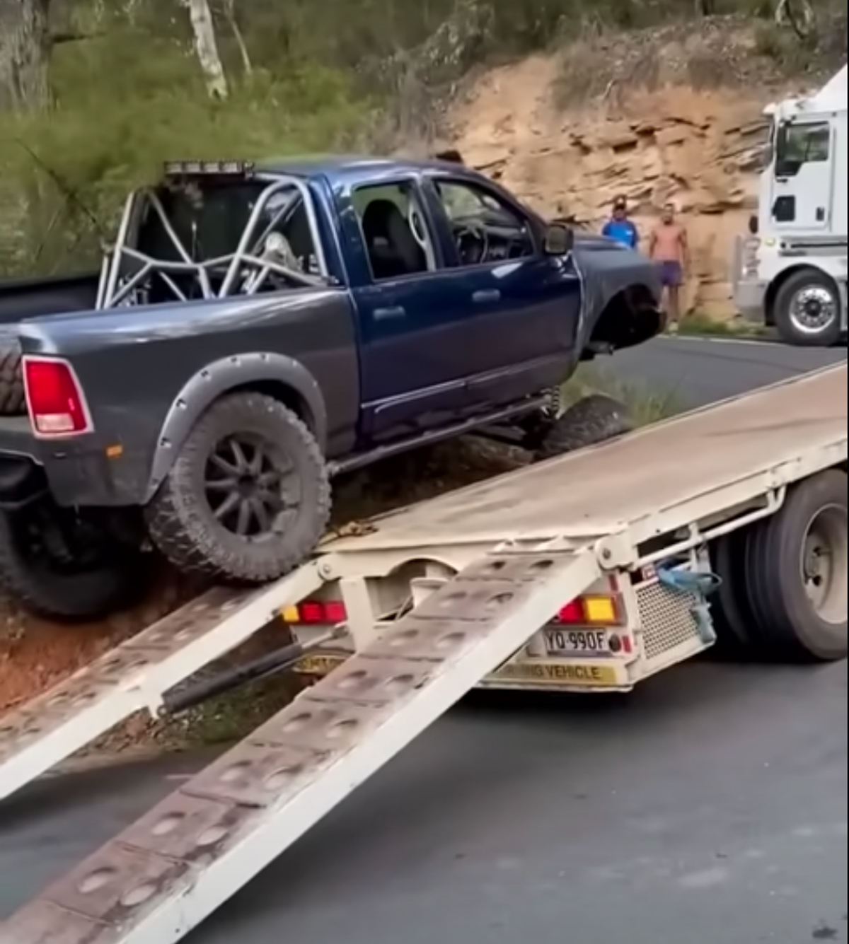 There is no world where a stock truck makes this climb. Hell, a normally modded truck probably couldn’t have made this recovery happen. The articulation is extreme. Even still, the Ram seems to be pushed to its limit several times. The Drive found the truck owner’s Instagram, which shows a rad King suspension setup with some serious coil overs. Amazingly, the truck makes it over the trailer with only a brief bump on the rocker panel. However, the Ram truck’s job isn’t done yet.