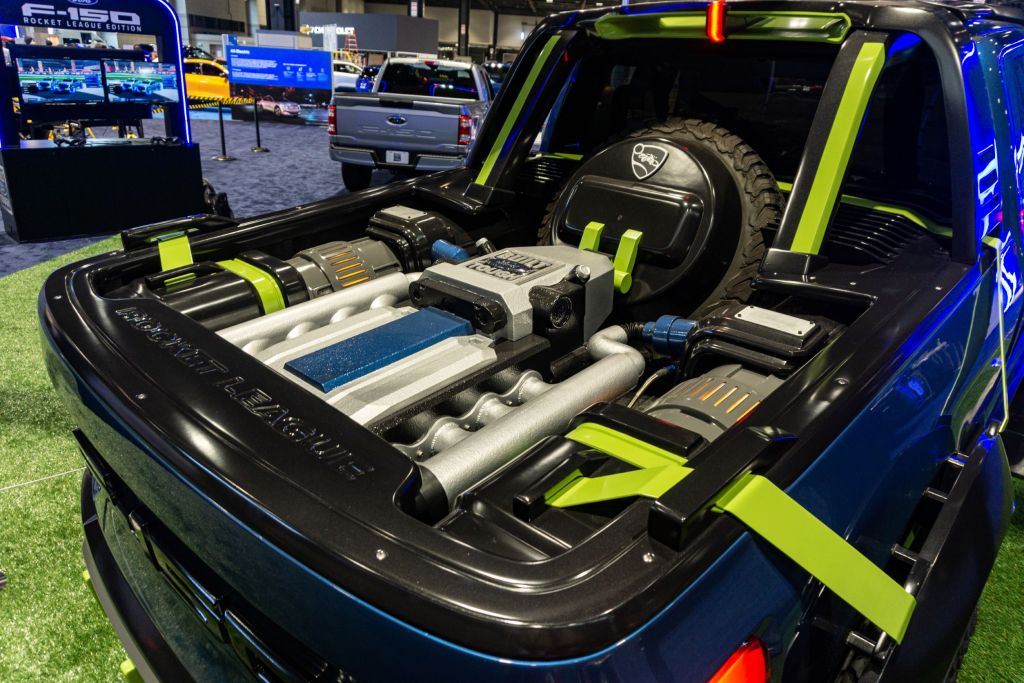 The product of this de-virtualization is the 2021 Ford F-150 Rocket League Edition IRL. On display at the 2021 Chicago Auto Show, it’s the closest thing to a real-life F-150 RLE. It even has a rocket booster in the bed, though it’s non-functional. And while the truck’s 37” wheels don’t glow blue fully, they are backlit with blue LEDs.