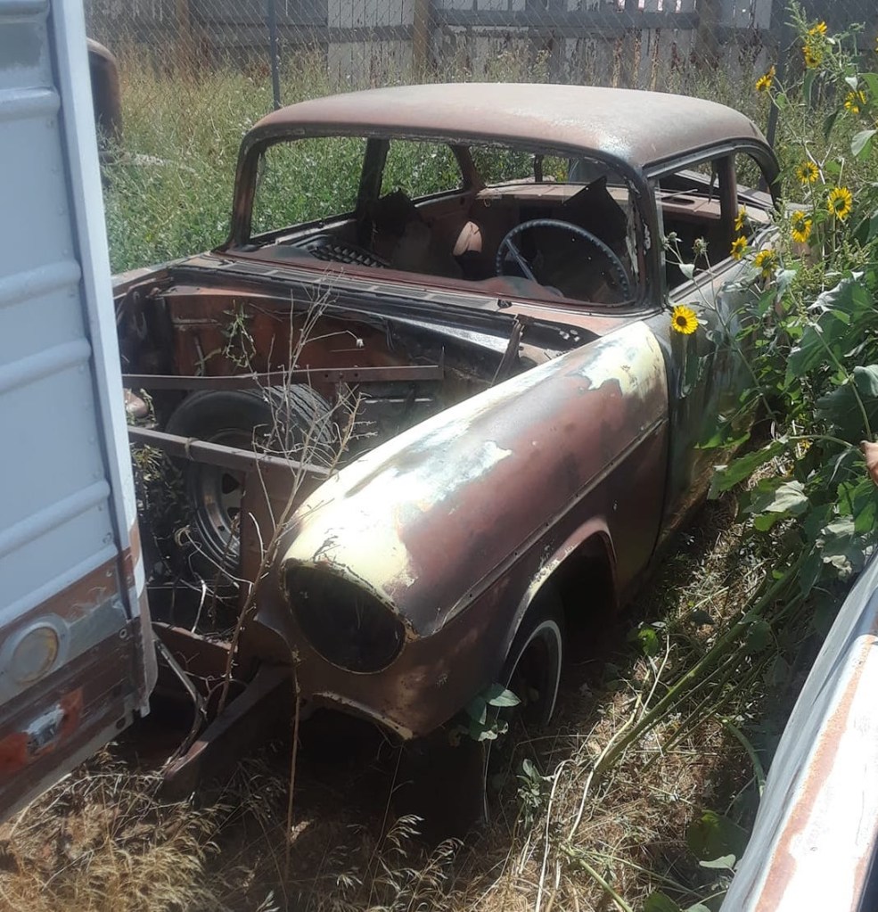 Another 1955 two-door sedan, this one has seen some drag racing action. The radiused rear fenders, no bumper, and American Daisy mag wheels point to a life taken in quarter-miles. Or maybe it was just a street rat. Whatever, it deserves to be brought back to its former glory.