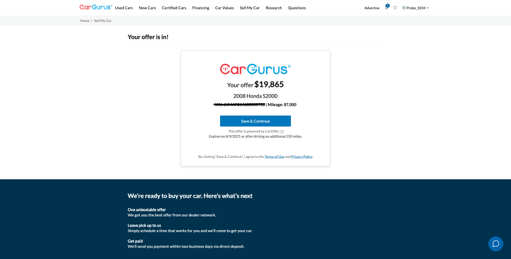 To see how easy it was, I decided to see what steps would be necessary if I wanted to sell my 2008 Honda S2000. After logging onto CarGuru’s “Sell My Car” page where sellers can find their instant cash offer, I was greeted with a series of fields to fill out about my car. After clicking “continue” at the end, I was greeted with an instant cash offer of $19,865 within seconds.