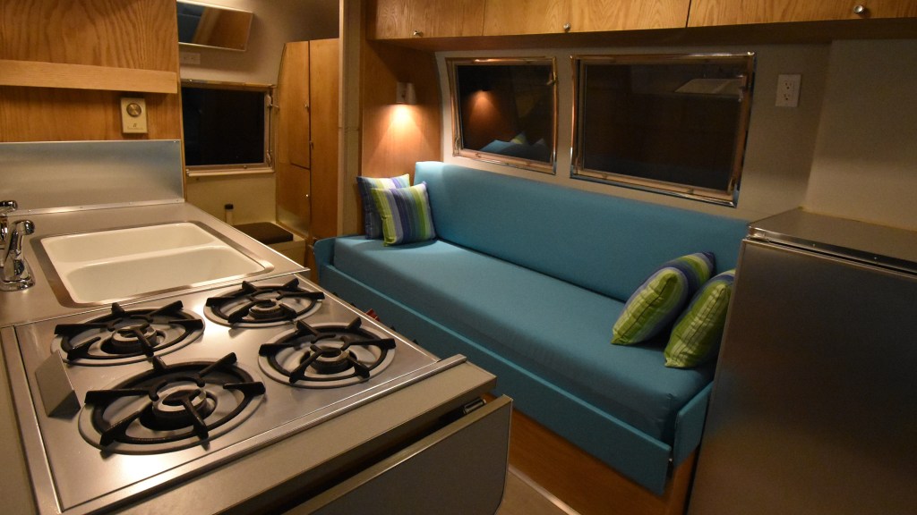 Keeping the vintage vibes correct, the seller also refurbished the cabinets and re-trimmed all of the upholstery to be new but look old. The floors and countertops, however, were updated with a more modern aesthetic. He even kept the original refrigerator, range top stove, and furnace.