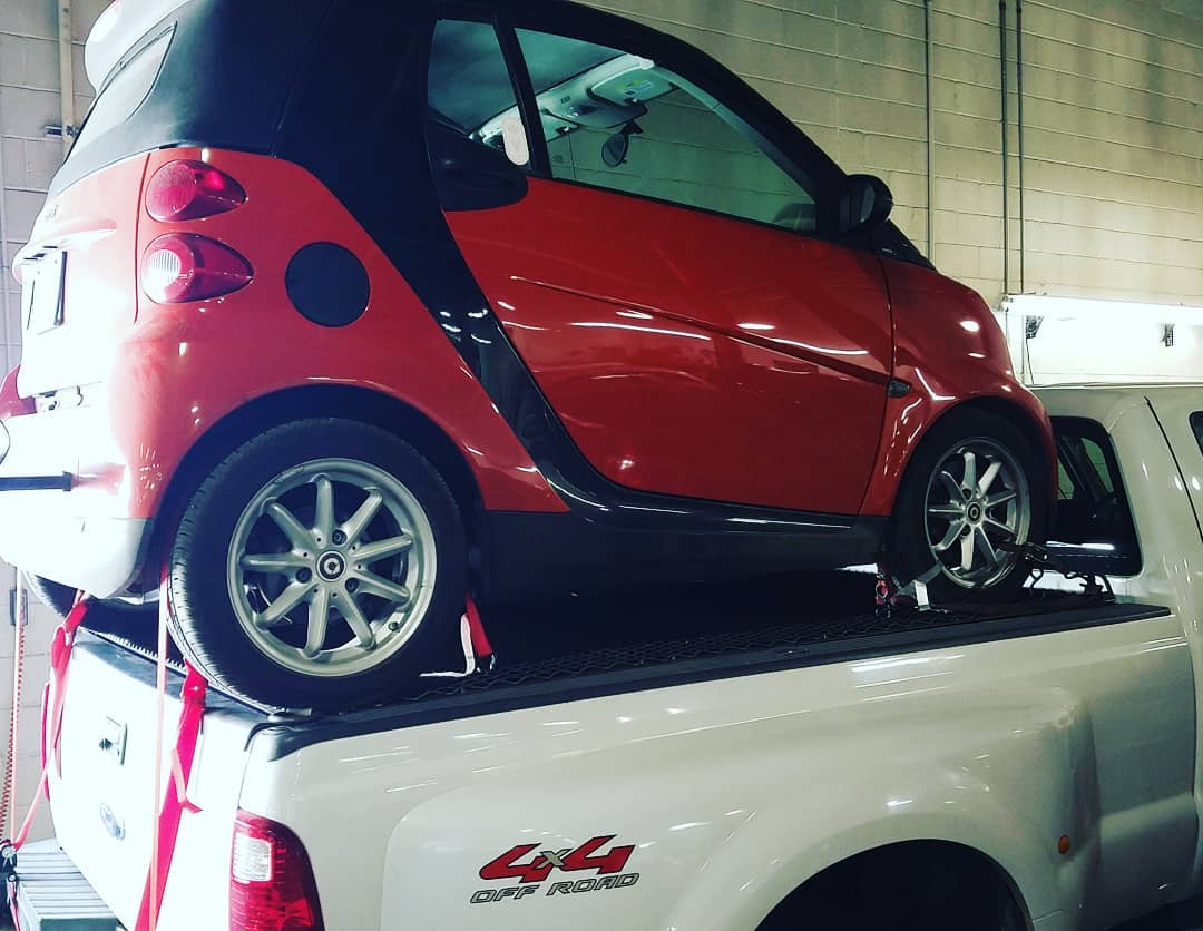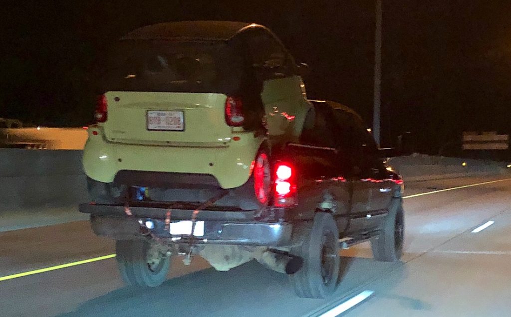This setup looks like it has been engineered well but why is this better than using the hitch he’s got hanging out the back of the truck?It’s a Smart car but is it smart to do this?See above!