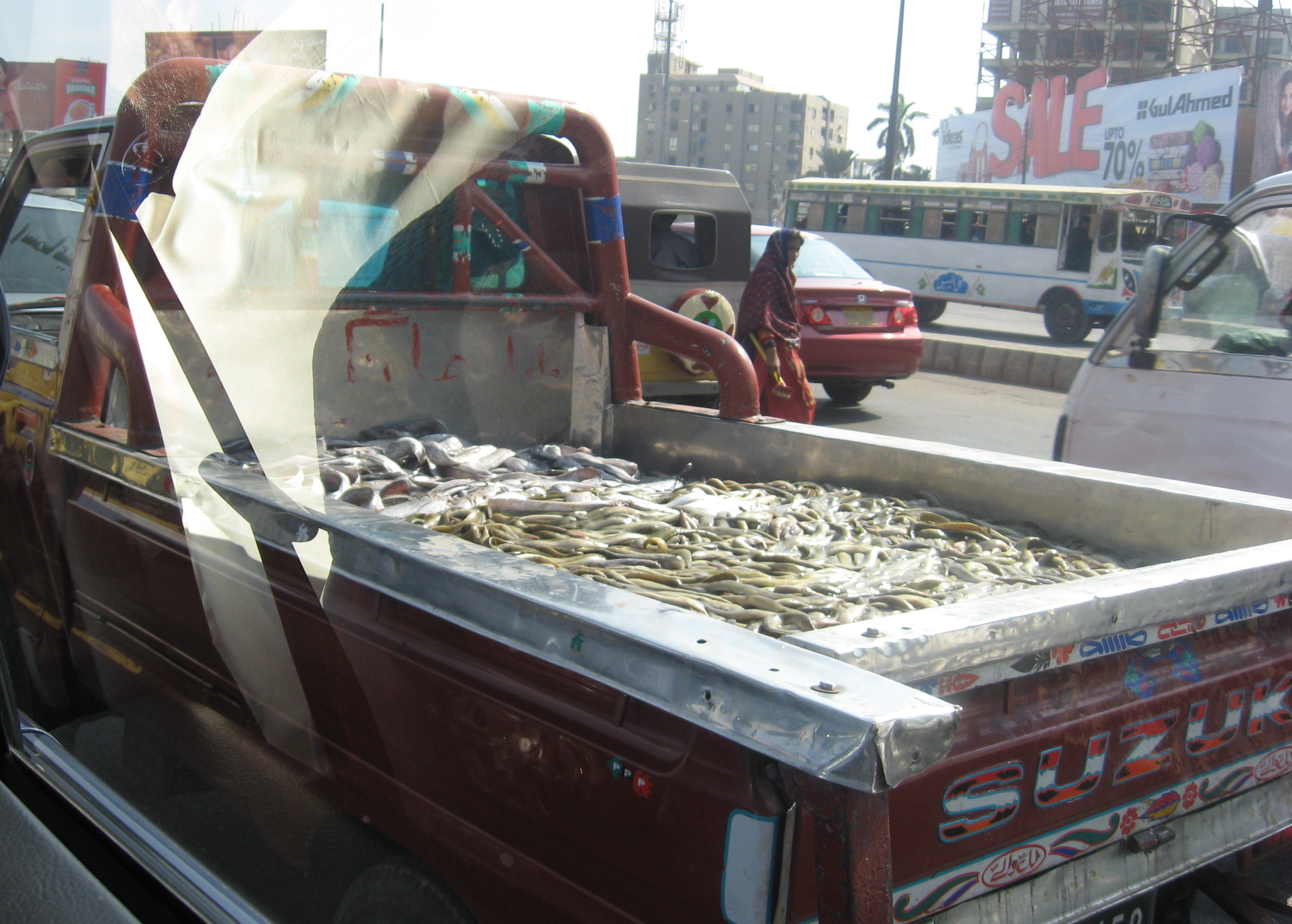 Not sure whether he’s gassing up to get home to cut this up for the freezer or to get to his taxidermist? At least he should tie a red flag on the fin to warn drivers behind him.
