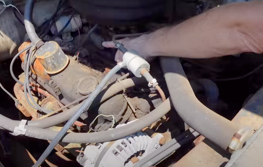 A look inside of the cabin shows a truck that had a “radio delete,” which means a block-off plate in place of a radio. It also has a block-off plate for the passenger side sun visor. Believe it or not, on these big work trucks, a passenger sun visor was an option.