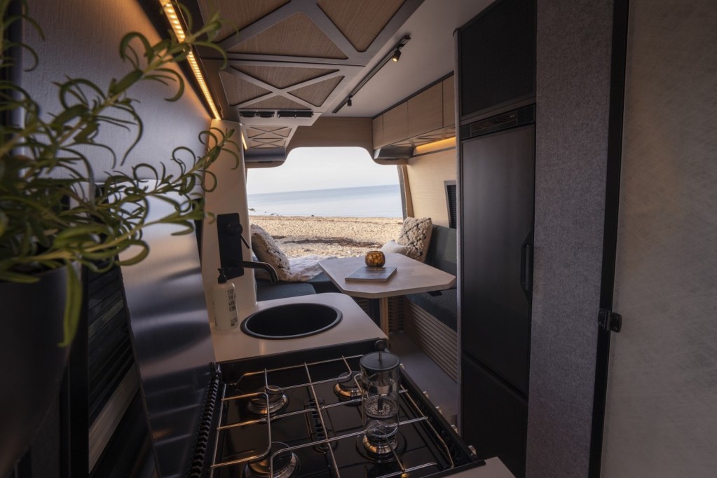 Most camper vans will have a gas burner or two in the galley-style kitchen, even though having a built-in grill is clearly the better and more fun option. Given the space requirements of most grills, this rarely a viable option for most vans. Thankfully the Loef made it a priority.