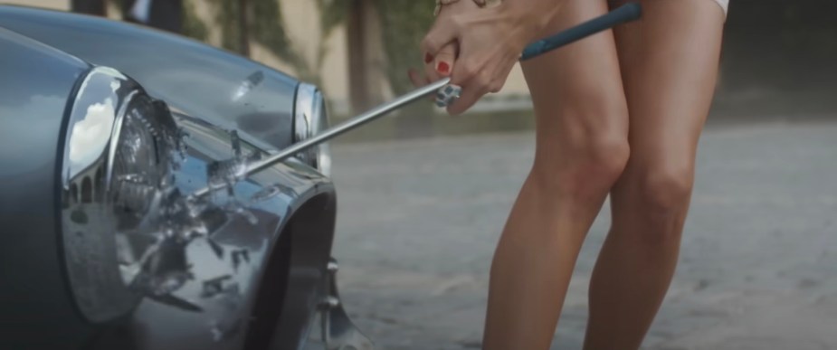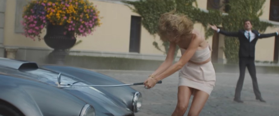 Swift’s team wanted to pivot away from her “good girl” image. So much of the music video shows Swift sabotaging a lover’s life during their messy breakup. She drops his phone in a fountain, cuts holes in his clothes, and finally takes a golf club to his sports car. The car in question is a dark gray Shelby Cobra.