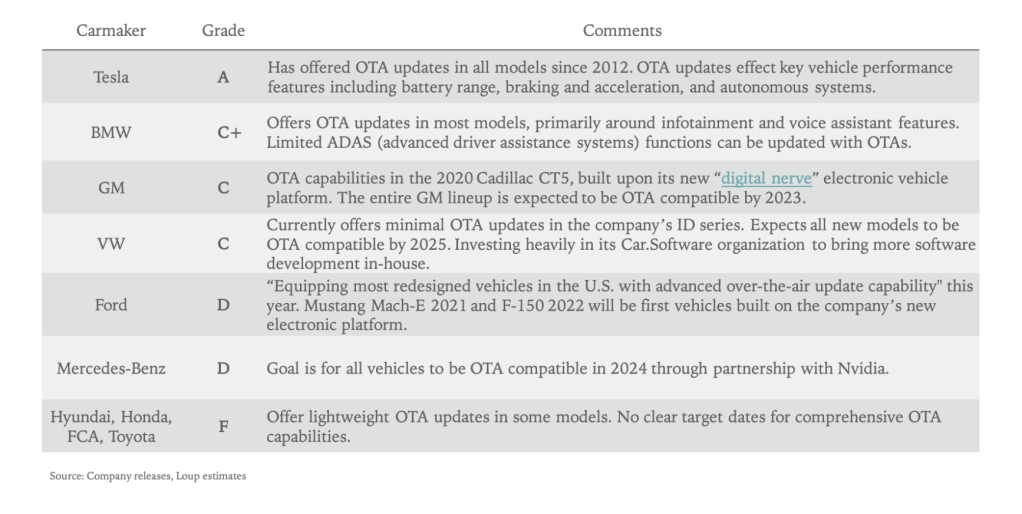 How can this be claimed? Because Loupventures, a tech research firm, has put together a scorecard of the EV manufacturers that incorporate OTA updates. What it found was that other than Tesla most other manufacturers only offer infotainment system OTAs.