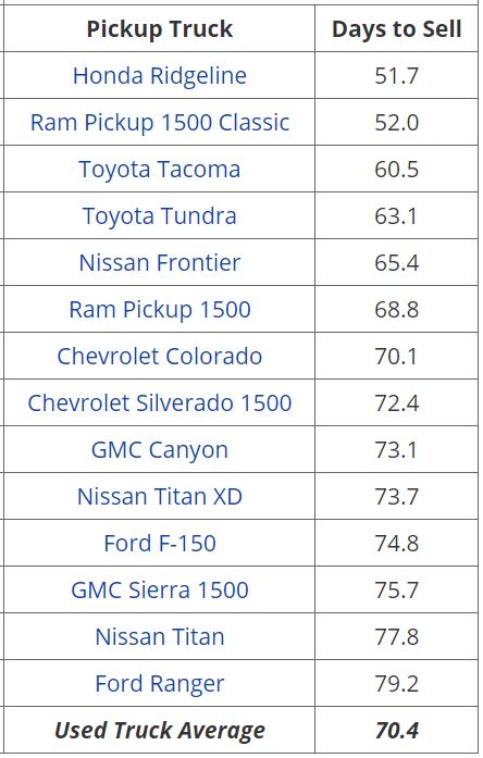 The good news, however, is in the Honda Ridgeline camp. The Honda Ridgeline has never been a top-selling pickup when it comes to the new side of the market. Consumers have often argued whether the Ridgeline was even a real pickup. Regardless, the trucks seem to sell pretty quickly in the used market, faster than all other brands for this period. That means that consumers have found something they like and are seeking the trucks out.