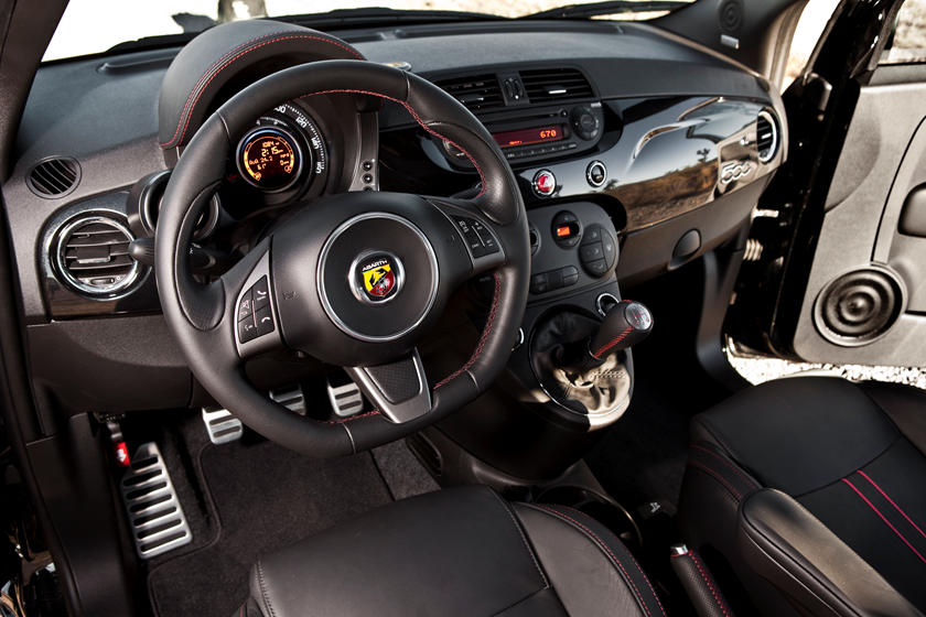 The Abarth distinguishes itself from the standard 500 with a spoiler, dual exhaust system, and side sill ground effects. Inside high-back bucket seats, a racing harness, three-spoke leather-wrapped steering wheel, five-inch touchscreen display, Bluetooth connectivity, a rear backup camera, and rear park assist are part of the package.