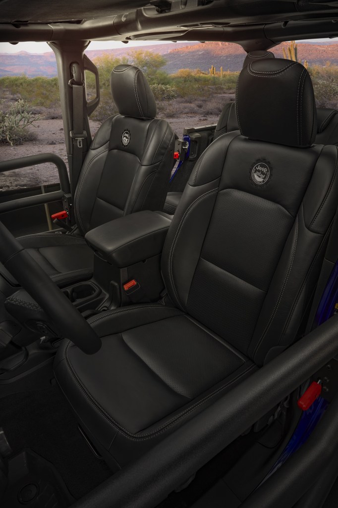 In addition, if owners find their JPP20 to be insufficiently off-road-ready, the SUV will also come with an owner’s kit that includes customer credit for a JPP 2” lift kit, 5” and 7” off-road LED light kits, and one of 5 different off-road wheel-and-tire combinations. The Wrangler JPP20 will already include a reinforced swing gate hinge for mounting larger spare tires.