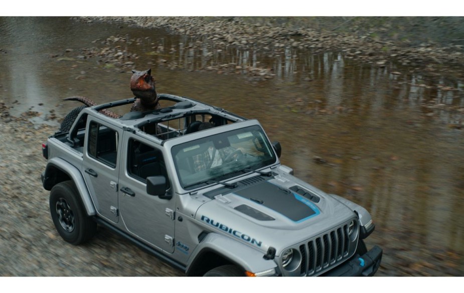 While it’s not as iconic, yet, as the original Wrangler, we’re expecting you’ll see silver and blue 4xe Wranglers around soon. Jeep created a cute baby Carnotaurus to be the star of the commercials for a new campaign that shows off the Wrangler from the new Jurassic World Dominion. The film is in theatres now. The new Wrangler 4xe is the plug-in hybrid version of the Wrangler that can be seen alongside many other Jeeps in the new film.