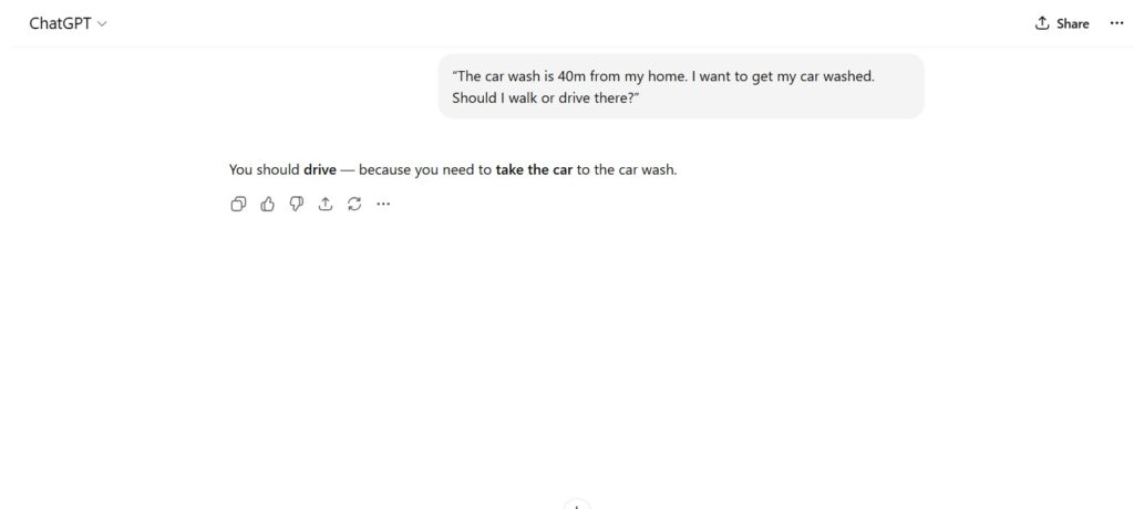 The distance varied between users, but the answers that most received were hilarious. When I asked ChatGPT whether to walk or drive to the car wash, it stated:
