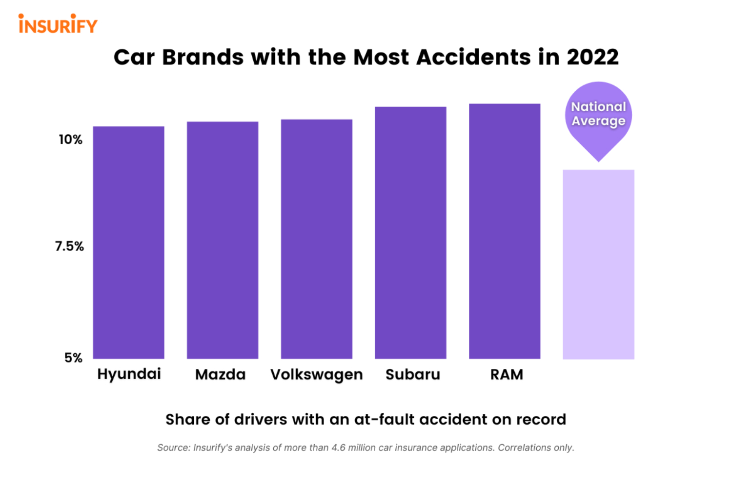Insurify looked at 4.6 million car insurance applications to determine which brands get into the most accidents. Those five brands are Ram, Subaru, Volkswagen, Mazda, and Hyundai. So far, in 2022, the national average for drivers with at least one at-fault accident on record is 9.25%. Kelley Blue Book data also shows the average price of a new car in May 2022 is $47,148, up 13% over last year.
