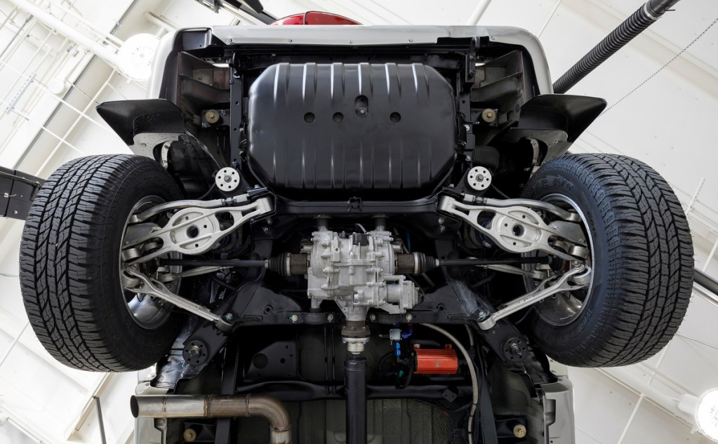 After installing the drivetrain and AWD, the engineers then installed custom rear and front subframes. Instead of a solid rear axle, this SLX now sports multi-link independent suspension. The wheels are 17” units from Fifteen52 and are wrapped with Yokohama Geolander A/T tires.