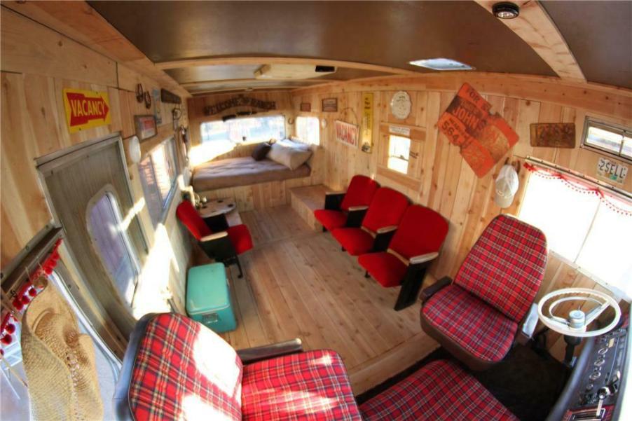 Stepping inside of this unique Winnebago and you might forget you’re in an RV altogether. The interior walls are lined with hand-crafted cedar panels to make it look as authentic as possible. The old theatre seating was reupholstered to match the homey plaid front bucket seats, tying the interior together to make it feel like a true home away from home.