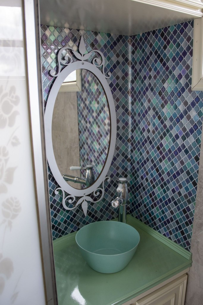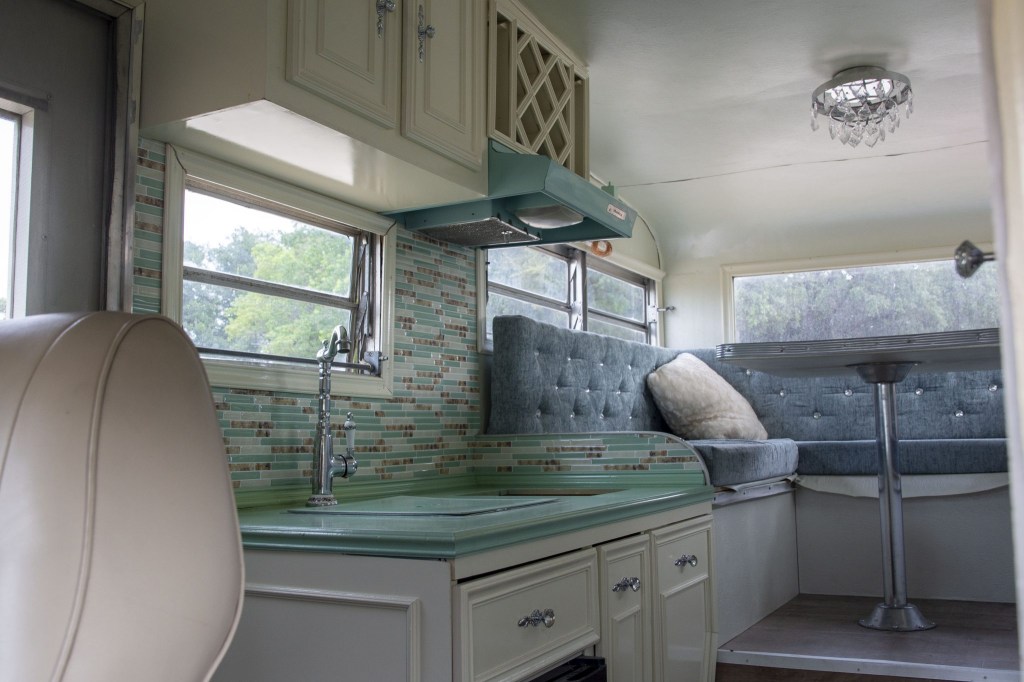 Inside the T2 Transporter conversion, there is a partially finished camper with a sink, tiled backsplash, U-shaped seating with a center table, a Hisense refrigerator, a lavatory, and even a chandelier. In the driver’s area, there is beige upholstery with cloth inserts. Beige carpeting and black rubber floors are featured throughout.