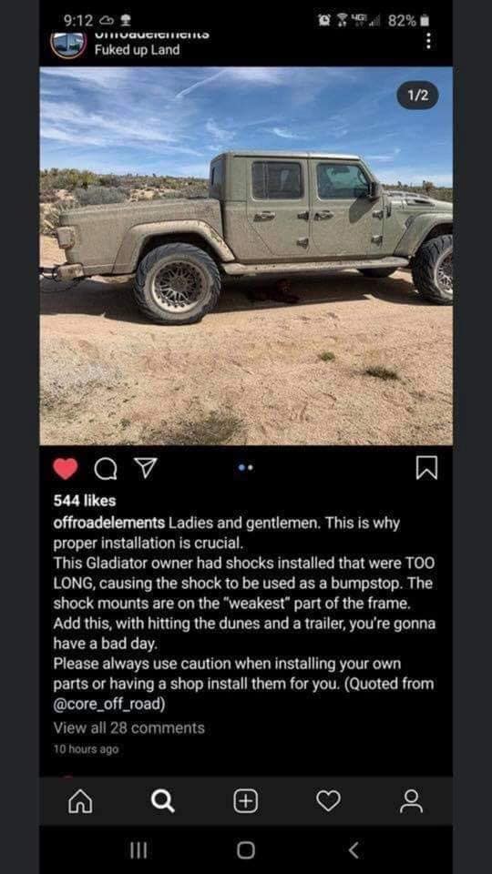 According to the post, this unfortunate Gladiator owner installed shocks that were too tall. Why we’re not sure? The point is because of that there’s a theory as to why this happened. If the shocks are too tall the shock’s rebound is shortened, effectively turning your shocks into two-by-fours once they’re completely compressed.