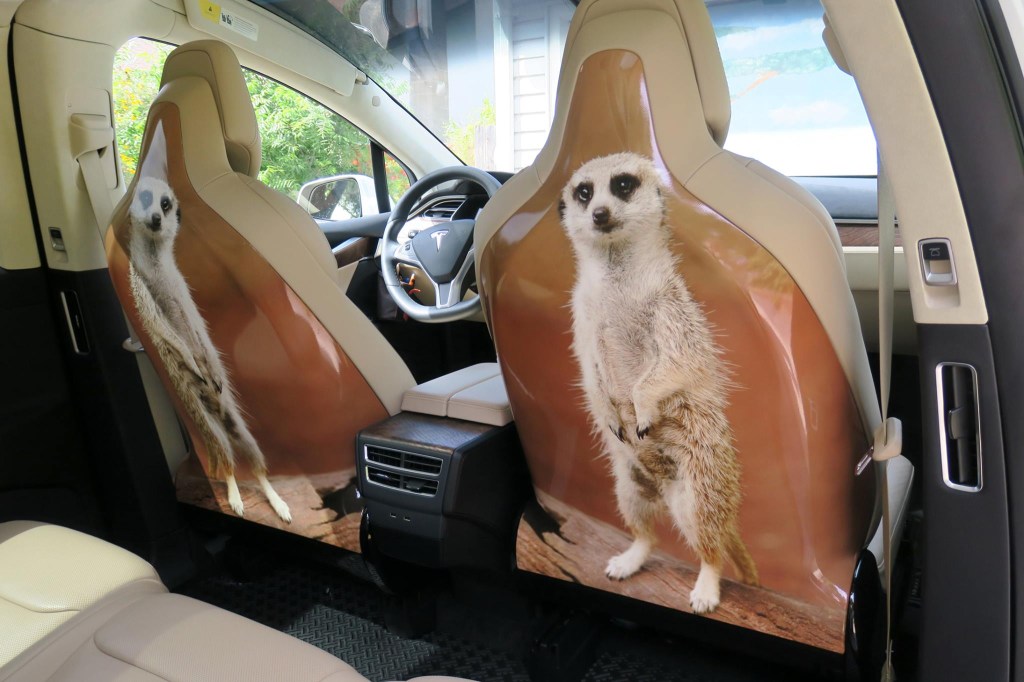 Inside the vehicle, the safari theme continues. Both driver and passenger seatbacks feature curious meerkats.
