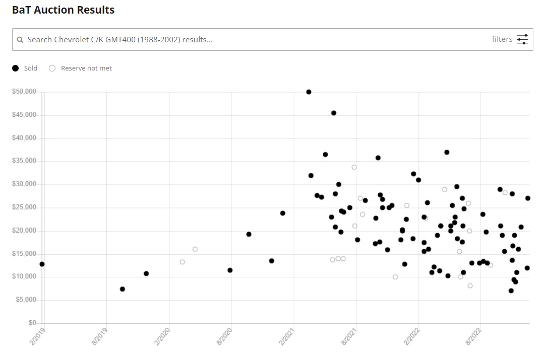 At Bring a Trailer, which tracks the prices of cars and trucks it sells, its data for 1998 to 2002 OBS (and early Silverado) Chevy trucks shows a steady price increase since 2020. CarGurus numbers also mostly track with Classic.com’s moving price average chart, too. In 1998 square body Chevys were selling for about $14,300 on average, while they’re averaging about $20,000 today at Classic.com.