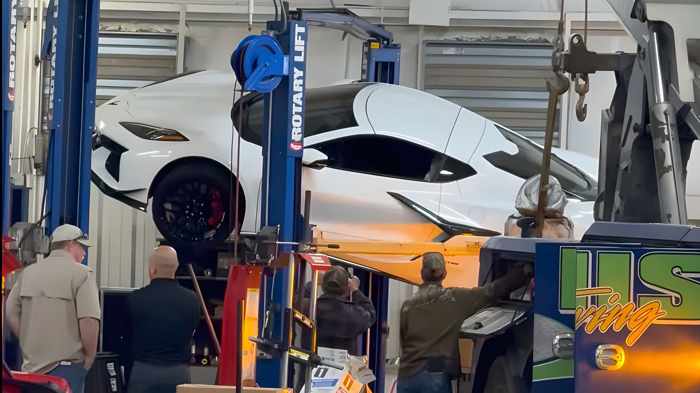 It is the absolute last thing you want to see when you drop your prized sports car off at the shop for routine maintenance. A horrifying video has surfaced showing a terrifying garage mishap involving a pristine white Chevrolet Corvette C8, a two-post lift, and a desperate rescue operation that required calling a heavy-duty tow truck directly into the service bay.