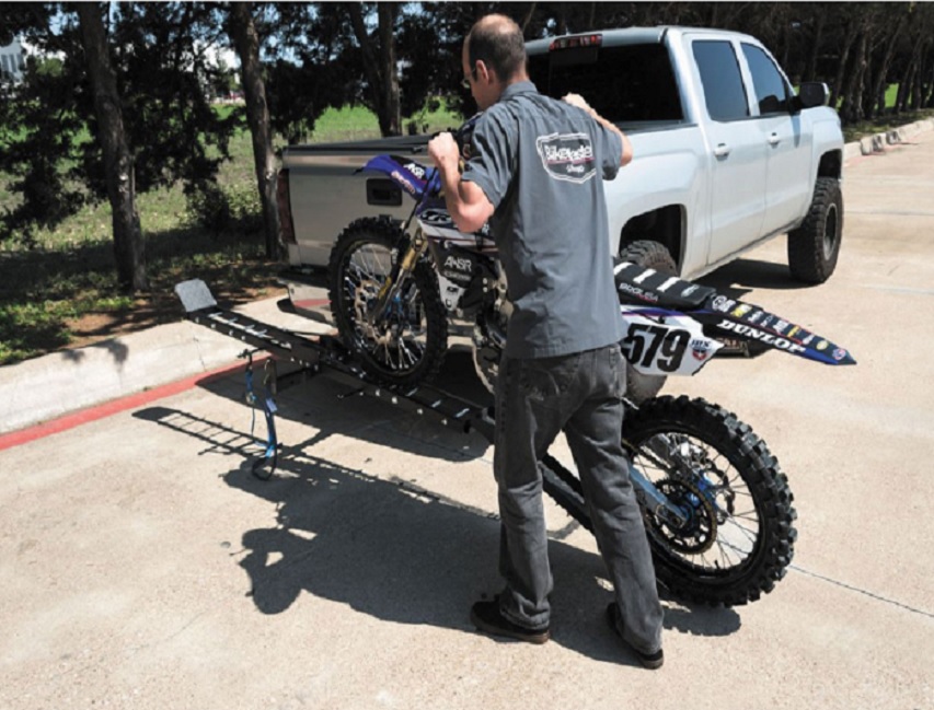If you’re only transporting one bike, a motorcycle carrier may be a better option. Essentially a bicycle rack sized for one motorcycle, carriers don’t have to be registered. They also have a built-in ramp and wheel chock. Fitting a motorcycle carrier does require an existing trailer hitch, and carriers have lower weight limits than the bed or trailer might have. But for carrying a dirt bike to the local trail? Shouldn’t be a problem.