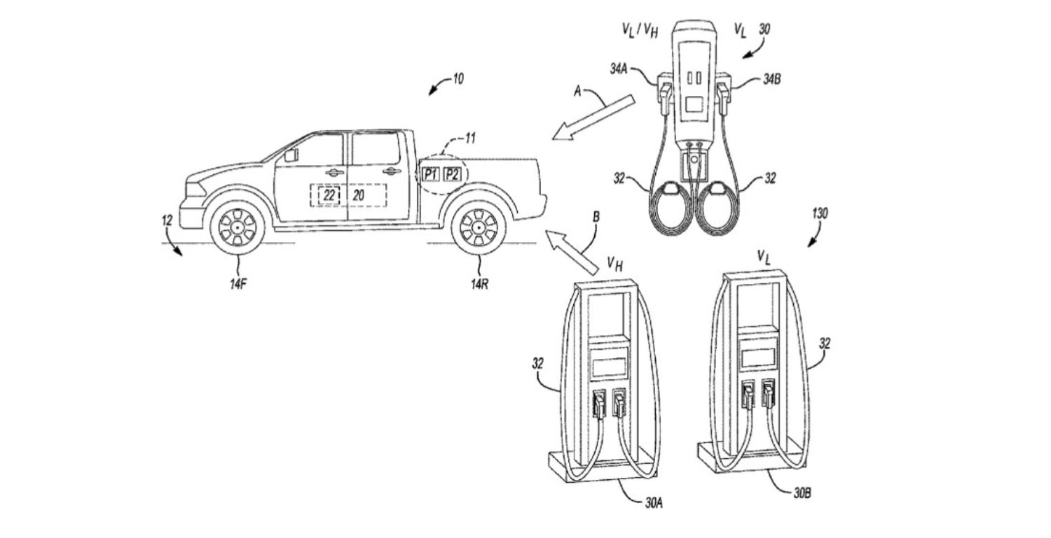The drawing included with the patent shows more detail. An electric truck, perhaps the Chevy Silverado EV, has two battery packs shown (22 / 20). It also indicates two charging ports on the right side of the vehicle (P1 / P2). Then, there are drawings of the charging stations showing two charging cables per station.