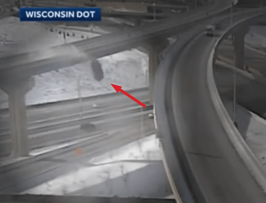 This happened in Wisconsin, on the I-94 in West Allis, by the Zoo interchange. The roads were icy and that is what started the problems. But the main culprit was snow piled up against the shoulder of the interchange flyover. Emphasis on “fly” over.