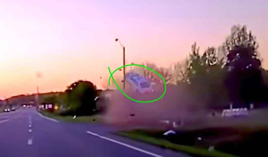 You can see the truck pitched in front of the police car at over 100 mph as it rolls onto its side. As the two vehicles slide together leaving the highway the truck hits a culvert that launches the police car over the truck. At that moment the truck is on its top as it smashes into the far side of the culvert crushing the cab.