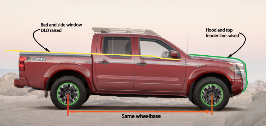 The Nissan Frontier body is the same, too. The outer sheet metal has been changed for sure. But the inner body, cowl, doors, top, and doors are the same. One interesting note is that to give the impression of an entirely new truck Nissan raised the bed a few inches. It also raised the bottom of the side windows to line up with the bed top.