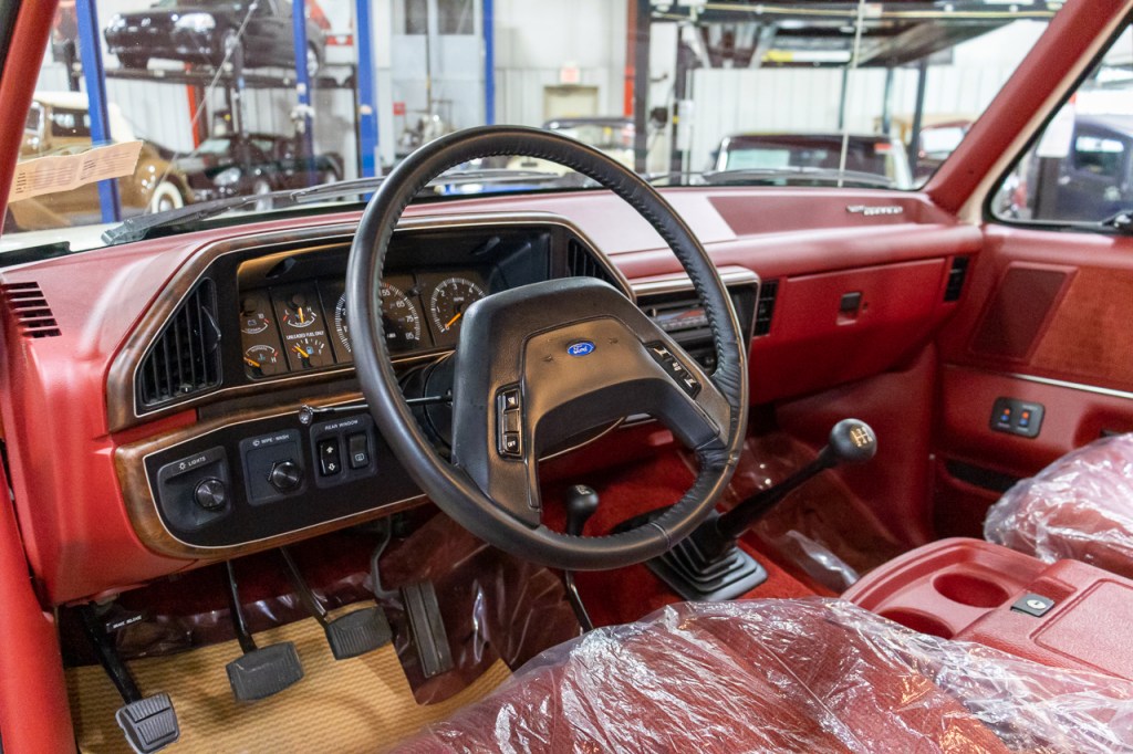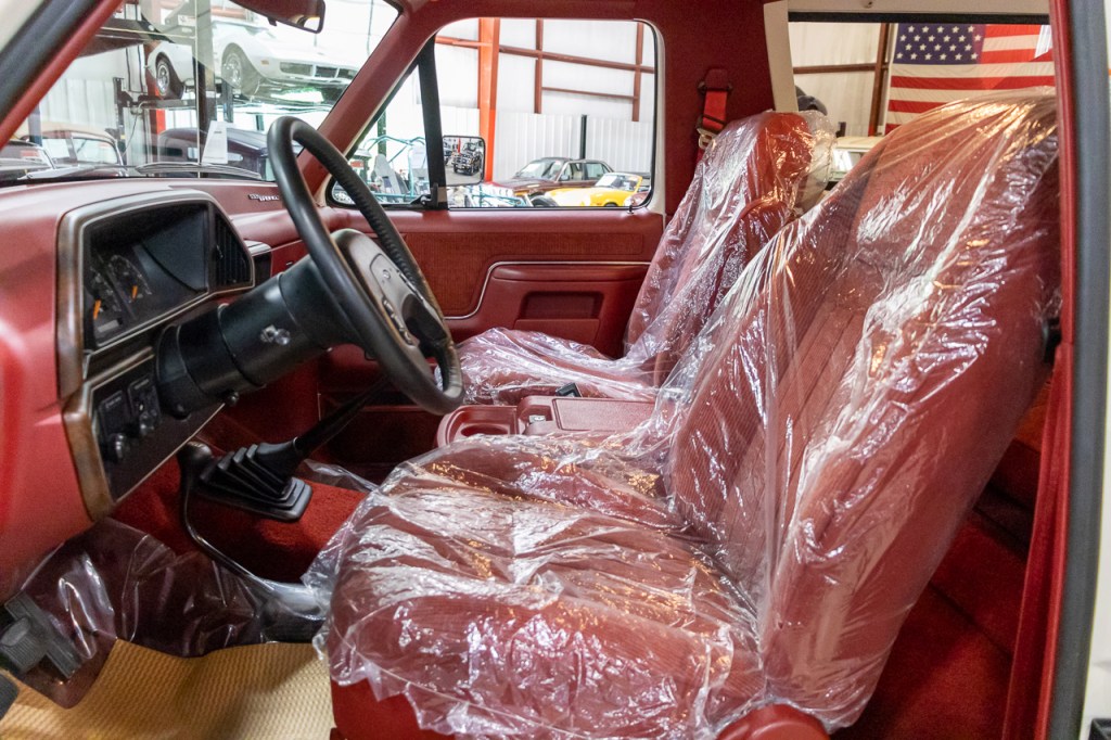 The Bronco is painted Colonial White with a Scarlet Red cloth interior. For power, it has the base 4.9-liter inline-six. That is backed by a five-speed manual transmission and a dual-range transfer case. It has power steering and brakes, a limited-slip differential, manual locking front hubs, Preferred Equipment 684, and the Heavy Duty Service packages.