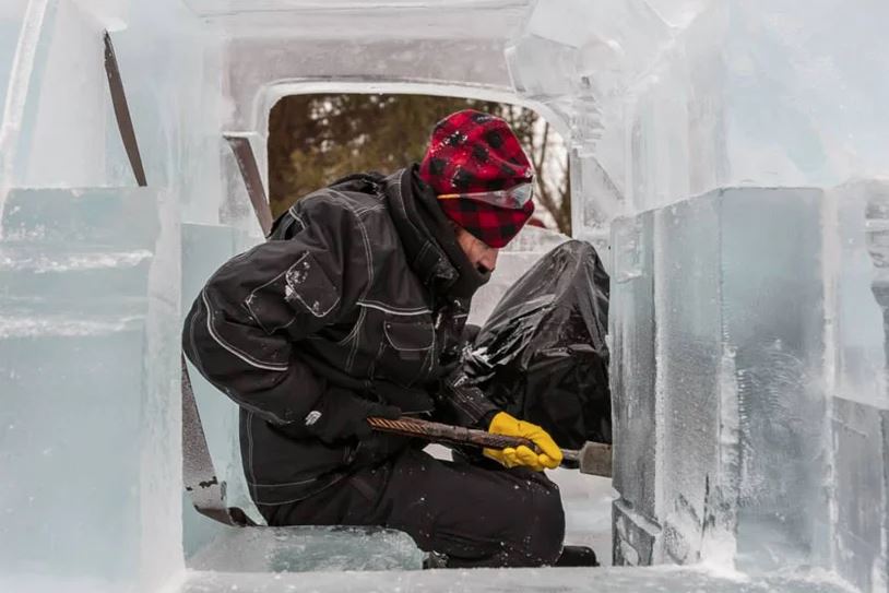 The deal was to find a pickup truck then strip off the body and place chunks of ice onto it. Then the details of the truck would be carved into the blocks. All of this was put into motion before sanity came to the proceedings.